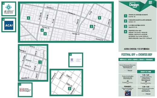 Durante el BOGOTA DESIGN FESTIVAL - BDF los visitantes utilizan nuestro MAPA para orientarse, recorrer y conocer el Festival OFF y todos los eventos aliados, las marcas, empresas, entidades y creativos participantes, quienes utilizan sus propios espacios (locales, talleres, auditorios, galerías, restaurantes) para presentar al público su oferta de productos y servicios, mostrando todos los ángulos de la creatividad, la innovación y el diseño de la ciudad.