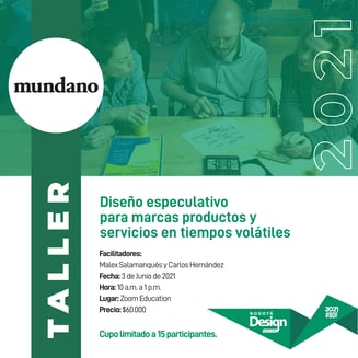 La firma MUNDANO con sedes el Londres y Bogotá, está organizando en este BDF2021 un Taller que nos invita a: "Imaginar el futuro de su Marca aplicando técnicas de Diseño Especulativo".