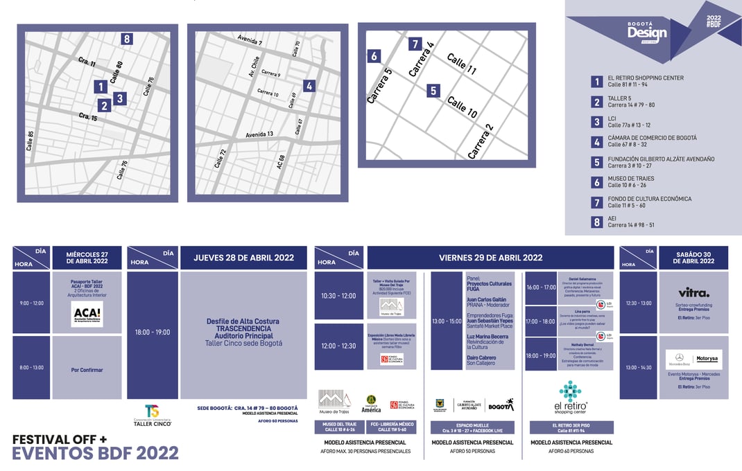NOTA 2: El MAPA DIGITAL 2022 del BOGOTA DESIGN FESTIVAL - BDF, pueden descargarlo (Versión PDF abajo) para consulta en sus celulares y tablets, y así estar informados y actualizados de los lugares, actividades, eventos y talleres del BDF 2022.